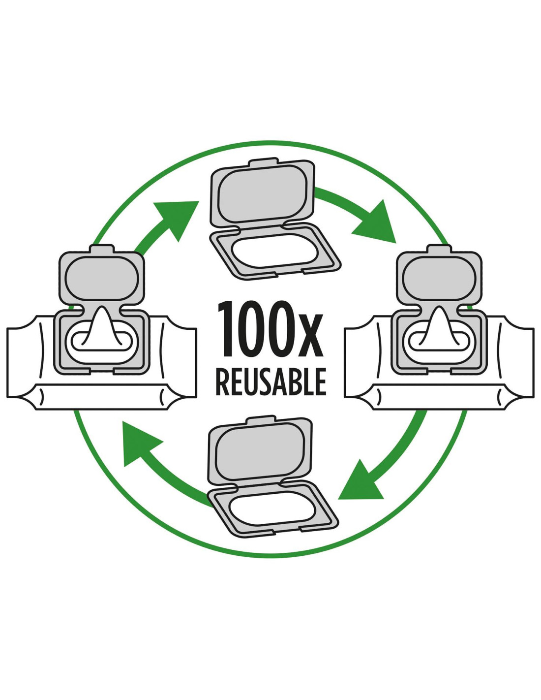 Dank der speziellen Klebeschicht lässt sich der Deckel bis zu 100 Mal wiederverwenden. Ist eine Packung leer, einfach abziehen und auf die nächste kleben. Sollte der Kleber verschmutzt sein, lässt er sich ganz leicht mit Wasser abspülen, trocknen – und schon ist der Deckel wieder einsatzbereit.