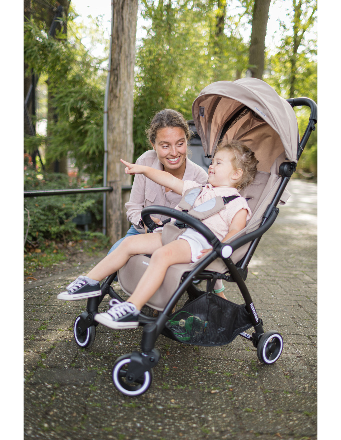 The stroller can be folded compactly and can remain standing. Thanks to a belt, it is also easy to carry by hand. Taking it on the train or in the car is therefore no problem at all! The stroller fits in most aircraft luggage compartments.
